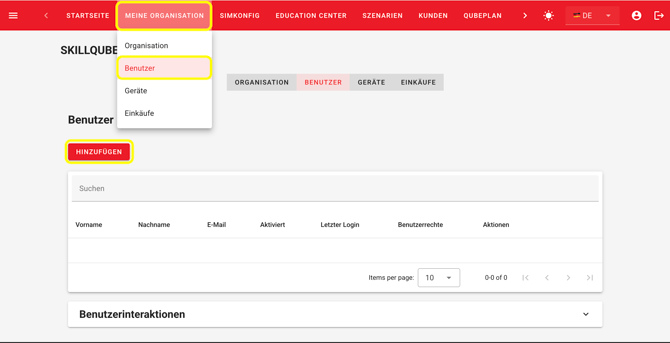 Neue Benutzer müssen durch den jeweiligen Administrator der Organisation angelegt werden. Dies ist unter cloud.skillqube.com möglich. Unter Meine Organisation > Benutzer und einen Klick auf den Button Hinzufügen, kann ein neuer Benutzer angelegt werden. Sollte der entsprechende Button nicht angezeigt werden, wenden Sie sich bitte an den Administrator bzw. Geräteverantwortlichen.