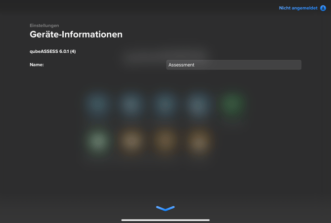 Der Name der Assessment-App kann innerhalb der App geändert werden. Dazu entweder in der App oben links auf das blaue Zahnrad klicken, um die Geräte-Informationen zu öffnen. In den Geräte-Informationen wird unter anderem der Name angezeigt. Jetzt muss nur noch das Textfeld angeklickt werden, um den Namen zu ändern. Die Änderung wird automatisch gespeichert.