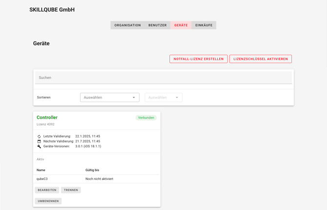 Der Controller-Name entspricht immer dem Namen der aktivierten Lizenz. Der Name der Lizenz kann in der qubeCLOUD unter Meine Organisation > Geräte angepasst werden. Dort muss zunächst die entsprechende Lizenz gesucht werden. Anschließend kann unten in der Lizenzkachel die Lizenz umbenannt werden.