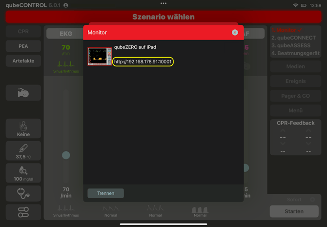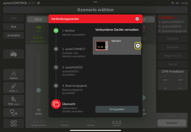 - Um den Controller und den Monitor zu verbinden, tippen Sie auf dem Controller rechts oben auf den rot blinkenden Button Gerät verbinden.