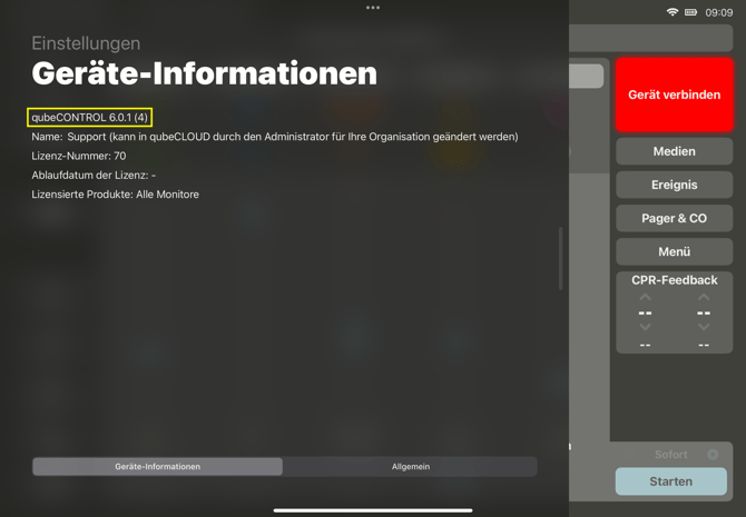Zuerst sollten bei Controller und Monitor jeweils die Versionsnummern kontrolliert werden. Hierzu müssen in beiden Apps die Geräte-Informationen geöffnet werden. Dazu entweder innerhalb der App auf das App-Logo (qubeCONTROL, z. B. qubeC3, qubeX etc.) klicken oder innerhalb der App vom linken Bildschirmrand in Richtung Mitte wischen. In den Geräte-Informationen wird unter anderem die Versionsnummer angezeigt. Hier sollte auf jeden Fall die erste Zahl, idealerweise die ersten beiden Zahlen übereinstimmen. Die letzte Zahl kann unterschiedlich sein, die Zahl in Klammern spielt keine Rolle (z. B. 5.0.2 (2) und 5.0.0 (31)).